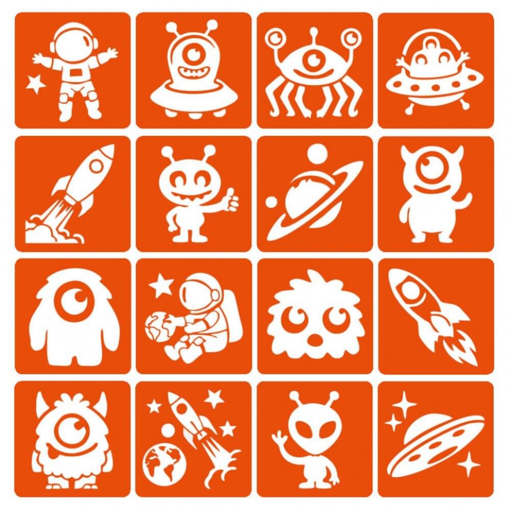Набір складається з 16 трафаретів з дизайнами на тему монстрів і ракет. Підійде для створення біо-тату та гліттер-тату, а також для дитячої творчості, майстер-класів і тематичних заходів.