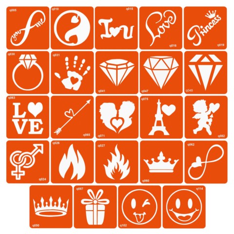 Колекція простих трафаретів різних, 24 штуки в розмірі 6 на 6 см.Як зробити біо-тату: виберіть рівномірну ділянку шкіри; добре знежирте її; зніміть із трафарету білу підкладку (паперова основа трафарету); приклейте трафарет на суху і знежирену шкіру; акуратно зніміть прозору плівку і переконайтеся, що трафарет (помаранчева частина) щільно приклеєний до шкіри; нанесіть рівномірний шар клею для боді-дизайну і дайте йому просохнути (від 30 секунд до 2 хвилин залежно від шару клею); нанесіть гліттер (блискітки) на клей і щільно вбийте його пензлем для гліттера; змахніть надлишки гліттера пензлем-зміткою і зніміть трафарет.Для чого потрібен трафарет: якщо не вмієте малювати від руки; якщо потрібно багато і швидко малювати; потрібно створювати однакові і за розміром, і за зовнішнім виглядом малюнки - скористайтеся трафаретами Fresh Tattoo; трафарети Fresh Tattoo безпечні для шкіри та підходять для нанесення тимчасових тату всіх типів: гліттер-тату, хною, оксамитом, пігментом, джагуа-гелем тощо; підходять для хімічного або піскоструминного матування виробів зі скла (чашки, келихи, дзеркала)