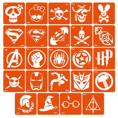 Колекція простих трафаретів піратів і супер-героїв, 24 штуки в розмірі 6 на 6 см.Як зробити біо-тату: виберіть рівномірну ділянку шкіри; добре знежирте її; зніміть із трафарету білу підкладку (паперова основа трафарету); приклейте трафарет на суху і знежирену шкіру; акуратно зніміть прозору плівку і переконайтеся, що трафарет (помаранчева частина) щільно приклеєний до шкіри; нанесіть рівномірний шар клею для боді-дизайну і дайте йому просохнути (від 30 секунд до 2 хвилин залежно від шару клею); нанесіть гліттер (блискітки) на клей і щільно вбийте його пензлем для гліттера; змахніть надлишки гліттера пензлем-зміткою і зніміть трафарет.Для чого потрібен трафарет: якщо не вмієте малювати від руки; якщо потрібно багато і швидко малювати; потрібно створювати однакові і за розміром, і за зовнішнім виглядом малюнки - скористайтеся трафаретами Fresh Tattoo; трафарети Fresh Tattoo безпечні для шкіри та підходять для нанесення тимчасових тату всіх типів: гліттер-тату, хною, оксамитом, пігментом, джагуа-гелем тощо; підходять для хімічного або піскоструминного матування виробів зі скла (чашки, келихи, дзеркала)