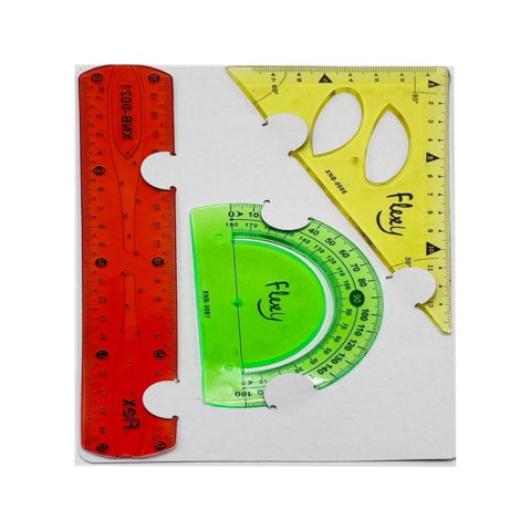 Набір виготовлено з гнучкого, нетоксичного пластику. Розмітка шкали виконана тисненням чорною фарбою, стійкою до стирання, що забезпечує довгу службу виробу. Легко гнуться, легко згинаються. У наборі: лінійка 20 см, 1 косинець, транспортир.