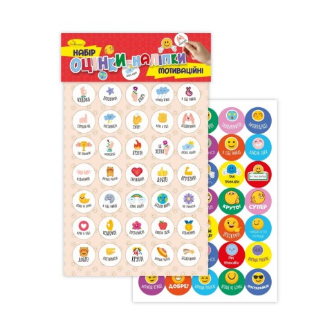 Мотиваційні оцінки-наліпки - саме те, що потрібно для вербального оцінювання в початковій школі, де оцінки відсутні. Також вони прекрасно підійдуть для використання в дитячих садочках. Ці яскраві стікери точно сподобаються дітям і замотивують їх до навчання.Оцінки-наліпки містять мотивуючі фрази, що спонукатимуть до дії, впевнено йти до своїх цілей, позитивно мислити, вірити в себе та свої сили.За допомогою оцінок-наліпок вчителі зможуть реалізувати методику заохочення маленьких учнів, у щоденники яких будуть вклеюватися симпатичні зображення із різноманітними фразами по типу:- дуже добре;- відмінно;- геніально;- бездоганно;- набагато краще;- спробуй ще;- я в тебе вірю;- ти зможеш;- це успіх;- хороша роботата багато інших.Формат/розмір: А5Кількість аркушів: 2Пакування та скріплення: запаковані в пакет поліпропіленовий з кольоровою картонною бандероллю.Блок: папір самоклеючий, крейдований папір; фігурна підсічка.