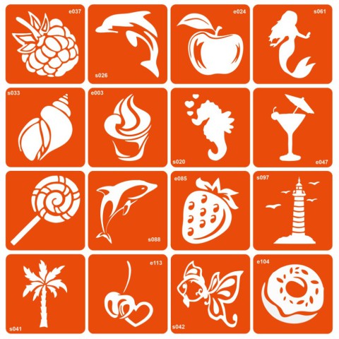 Колекція трафаретів літніх солодощів, 16 штук у розмірі 6 на 6 см.Як зробити біо-тату: виберіть рівномірну ділянку шкіри; добре знежирте його; зніміть із трафарету білу підкладку (паперова основа трафарету); приклейте трафарет на суху та знежирену шкіру; обережно зніміть прозору плівку і переконайтеся, що трафарет (помаранчева частина) щільно приклеєний до шкіри; нанесіть рівномірний шар клею для боді-дизайну та дайте йому просохнути (від 30 секунд до 2 хвилин залежно від шару клею); нанесіть глітер (блискітки) на клей і щільно вбийте його пензлем для глітера; змахніть надлишки гліттера пензлем-кошторисом і зніміть трафарет.Для чого потрібний трафарет: якщо не вмієте малювати від руки; якщо потрібно багато та швидко малювати; потрібно створювати однакові і за розміром, і на вигляд малюнки - скористайтеся трафаретами Fresh Tattoo; трафарети Fresh Tattoo безпечні для шкіри і підходять для нанесення тимчасових тату всіх типів: гліттер-тату, хною, оксамитом, пігментом, джагуа-гелем і так далі; матування виробів зі скла (чашки, келихи, дзеркала);