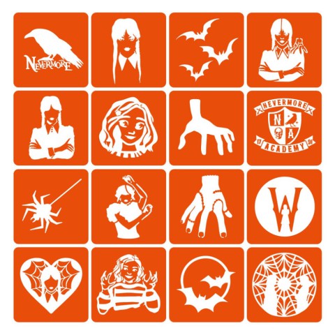 Колекція трафаретів Венсдей Адамс, 16 штук у розмірі 6 на 6 см.Як зробити біо-тату: виберіть рівномірну ділянку шкіри; добре знежирте його; зніміть із трафарету білу підкладку (паперова основа трафарету); приклейте трафарет на суху та знежирену шкіру; обережно зніміть прозору плівку і переконайтеся, що трафарет (помаранчева частина) щільно приклеєний до шкіри; нанесіть рівномірний шар клею для боді-дизайну та дайте йому просохнути (від 30 секунд до 2 хвилин залежно від шару клею); нанесіть глітер (блискітки) на клей і щільно вбийте його пензлем для глітера; змахніть надлишки гліттера пензлем-кошторисом і зніміть трафарет.Для чого потрібний трафарет: якщо не вмієте малювати від руки; якщо потрібно багато та швидко малювати; потрібно створювати однакові і за розміром, і на вигляд малюнки - скористайтеся трафаретами Fresh Tattoo; трафарети Fresh Tattoo безпечні для шкіри і підходять для нанесення тимчасових тату всіх типів: гліттер-тату, хною, оксамитом, пігментом, джагуа-гелем і так далі; підходять для хімічного або піскоструминного матування виробів зі скла (чашки, келихи, дзеркала);