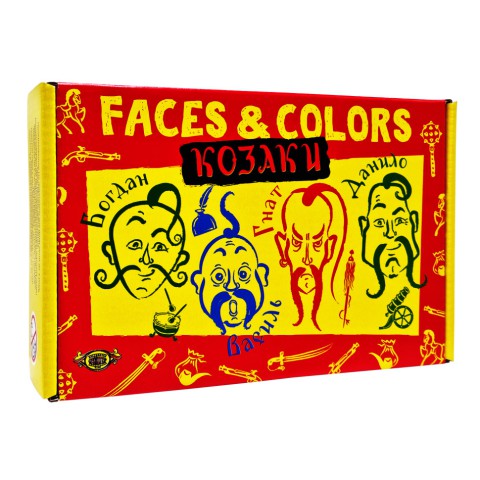 У комплекті: -24 ігрові картки із зображенням козаків-Богдан, Василь, Гнат, Данило( у трьох кольорах:червоний, синій і зелений)-по дві картки кожного героя у кожному кольорі;-4 спеціальні картки із зображенням шаблі й пістоля;-4 основні картки для підрахунку очок (жовтий фон);-3 додаткові картки для підрахунку очок (червоний фон);-20 пластикових фішок-по 5 ігрових фішок чотирьох кольорів);-правила гри.Ідея гри: Гравець має створити виграшні комбінації з чотирьох карток з максимальною кількістю бонусних очок.Гра закінчується, коли усі картки із зображенням козаків будуть викладені зі стопочок у відповідні рядки. Перемагає гравець, який набрав найбільше очок на своїй карточці (карточках) підрахунку очок.