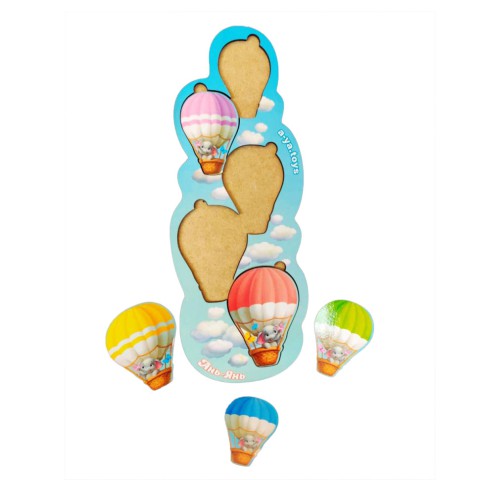 У наборі 5 слоників, які летять на повітряних кульках різного розміру і кольору. З цим додатком можна наочно пояснити дитині, що таке розмір і поняття "великий, середній і маленький".