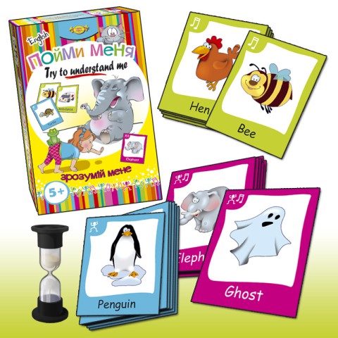 Чи зможете пояснити, що намальовано на картинці, без слів? Тільки звуки і міміка!Чудове тренування кмітливості, інтуїції та вміння розуміти іншого!Розкриває і розвиває акторський талант гравців!Гра пробуджує інтерес дитини до вивчення англійської мови і сприяє поповненню словникового запасу!Комплектація:картки «Звуки» - 24 шт.;картки «Пантоміми» - 42 шт.;картки «Звуки + пантоміми» - 24 шт.;пісочний годинник;англо-українсько-російський словничок;правила гри рос. і укр. мовами.Розмір коробки: 180х115х40 мм