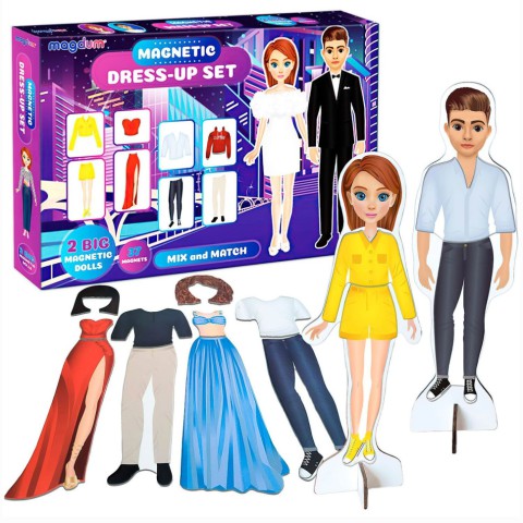 Створюй власний неповторний стиль за допомогою нової гри від "Magdum"! До ігрового набору входять 37 магнітів та дві великі магнітні ляльки. Для початку необхідно закріпити фігурки хлопчика та дівчинки на підставках, а потім - підбирати кожній з них одяг та змінювати зачіску. Гра допомагає розвивати смак та дрібну моторику рук, вчить комбінувати речі. Особливості:- 37 магнітів в наборі;- 2 великі магнітні ляльки на підставках;- захисна ламінація на магнітах;- лялькам можна змінювати зачіску та одяг;- в процесі гри дитина вчитиметься створювати стильний образ.