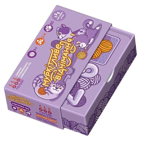 Кошенята бавилися клубочками і вони переплутались між кошиками. Тепер котики шукають свої кошики та викладають зайві клубочки з них. Кожен котик шукає одну, дві або три картки зі своїми кошиками, тобто картки, де значення виразу дорівнює числу біля котика.Гра найкраще підходить щоб вивчити склад чисел до 10, навчитись швидко віднімати та познайомитись з парними та непарними числами.Комплектація гриВ коробці 63 картки: 45 карток з кошиками та клубочками (виразами) і 18 карток з котиками (з числом, що є різницею виразу). На картках з кошиками всі вирази, які необхідні для того, щоб вивчити віднімання в межах 10, на картках з котиками всі необхідні для того числа від 1 до 9.Правила ігорВ коробці ви знайдете два варіанти ігор з котиками та клубочками: одноіменну гру Муркітливе віднімання та гру Злови Шустрика.Короткі правила ігор:У грі Муркітливе віднімання котики шукають свої кошики та викладають з них зайві клубочки, тобто картки з кошиками, де різниця виразу рівна числу біля котика. Виграє той гравець, у кого буде найбільше котиків під кінець гри.У грі Злови Шустрика гравці відкидатимуть картки парами і виграє той, у кого залишиться Шустрик.Також з картками з набору можна грати гру Муркітливе доміно. Вона подібна до звичайного доміно. Діти викладатимуть в ряд картки одну за одною за певними правилами. Виграє той, хто перший позбудеться своїх карток.