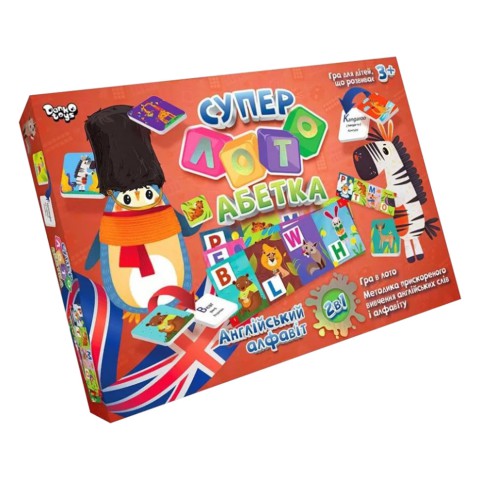 Цікава настільна гра. Правила гри схожі з класичним лото, тільки на фішках і картках замість цифр зображені літери. Мета гри - першим заповнити всі поля на картці відповідними фішками.Комплектація:Фішки-букви - 40 шт.,картки - 10 шт.,мішечок - 1