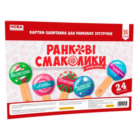 «Ранкові смаколики» - це картки-питання для ранкових зустрічей. Комплект містить 24 цукерки-питання для хорошого початку дня, позитивного настрою, пізнання себе та інших, навколишнього світу, формування дружніх відносин і розуміння різноманітності і різнобарвності життя! Питання на картках - практичні, покликані розвивати фантазію, уяву, мову, увагу, розуміння свого емоційного стану і вміння його висловити словами, - а це прямий шлях до формування психічно зрілої особистості, здатної протидіяти буллінг і випробуванням.