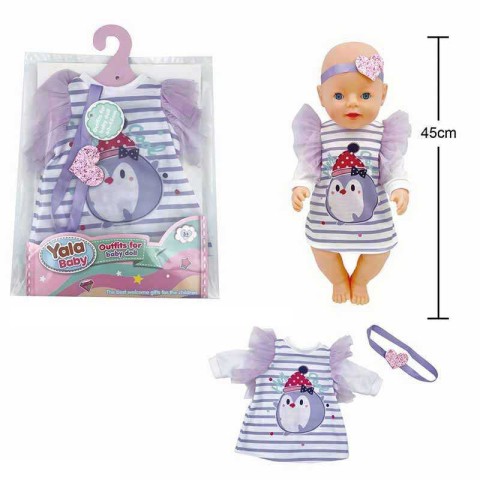 Доповніть гардероб пупса вашої дитини цим елегантним та чарівним комплектом одягу. Набір розроблений для пупсів розміром **40-45 см** і включає **красиву сукню та стильний ободок для волосся**, створюючи святковий або повсякденний образ. Одяг виготовлений з **якісних, м'яких текстильних матеріалів**, які легко одягаються та знімаються, що допомагає дитині розвивати дрібну моторику та навички догляду. Деталізоване пошиття імітує справжній дитячий одяг.