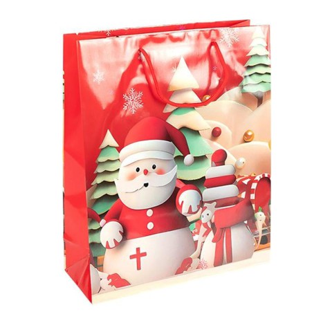 Подарунковий пакет новорічної серії розміром 26×32×10 см — стильне рішення для святкового пакування невеликих подарунків, солодощів і сувенірів. Виготовлений з щільного ламінованого паперу з глянцевим покриттям, стійким до вологи і пошкоджень. Яскравий дизайн із зимовими та новорічними мотивами створює атмосферу затишку та радості. Зручні шнуркові ручки забезпечують комфорт під час перенесення.