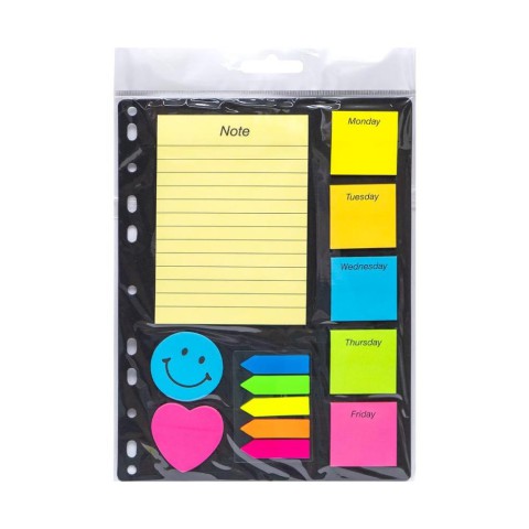 Набір стиків для нотаток на планшетці з отворами для кріплення в органайзер. У набір входять п'ять видів стиків з назвами днів тижня, 2 види зі смайликом і серцем, 1 для нотаток і п'ять стрілочних стиків-закладок. Розмір планшетки 19х26см