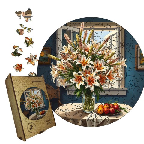"Букет лілій" - це естетичний дерев’яний пазл, що складається з деталей, які зображують прекрасні лілії. Подаруйте собі або близькій людині улюблені квіти у вигляді пазлів, та забезпечте декілька годин медитації під час складання композиції, якою в подальшому зможете прикрасити свій інтер’єр за допомогою монтажу.