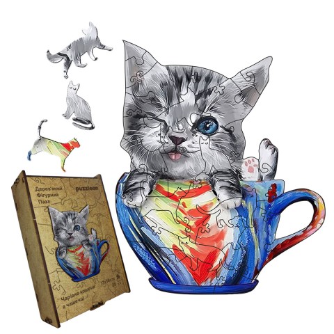 Пазл дерев'яний 'Чарівне Кошеня в чашечці': зануртесь у світ ніжності та милозвучності, складаючи цю магічну картину разом з надзвичайно миленьким кошеням!