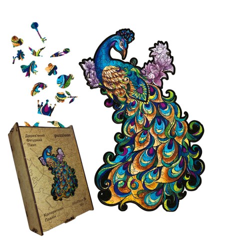 Пазл дерев'яний Колоритний Павлін, А5, Дерев'яна коробка 35 елементів