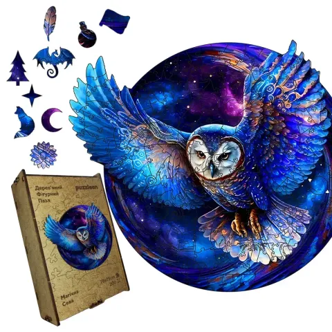 Дерев'яний пазл "Магічна Сова" — це витончена композиція, яка складається з фігурних деталей у вигляді тотемів, лісових звірів і міфічних істот переплітаються, утворюючи образ загадкової сови, що символізує мудрість, магію та гармонію природи.