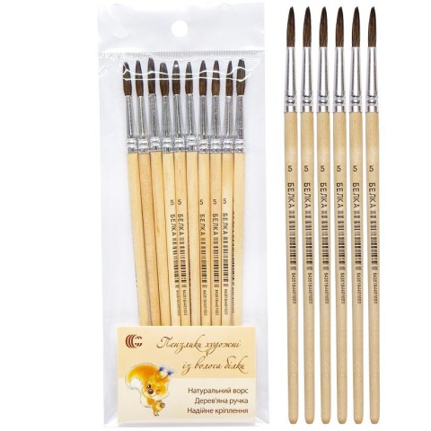 Пензлик художній Білка №5 виготовлений з натурального ворсу білки. Кругла форма підходить для акварелі, гуаші та акрилових фарб. Забезпечує плавні переходи та деталізовані елементи. Натуральний ворс утримує вологу і пігмент. Довжина пензля – 17 см. Упаковка містить 10 штук, ціна вказана за 1 пензлик.
