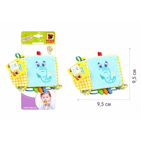 Іграшка виконана повністю з натуральних слинопоглинаючих матеріалів і не має гострих кутів, вона абсолютно безпечна для малюка. Кубик має масу цікавих елементів: різнокольорові вузлики і петельки, колечка, пищалки і шуршалки, з ним можна весело грати в хованки, закриваючи і відкриваючи вушка на липучках, без сумніву, він не дасть нудьгувати вашій дитині. Для зручності мам і тат у кожного кубика є роз'ємне кільце, за допомогою якого іграшку можна підвісити на ліжечко, коляску, манеж, автокрісло. Склад: бавовняна тканина; різнофактурні матеріали; швейна фурнітура; звукові елементи; холлофайбер; поролон. Розмір: 12 × 12 × 11 см.