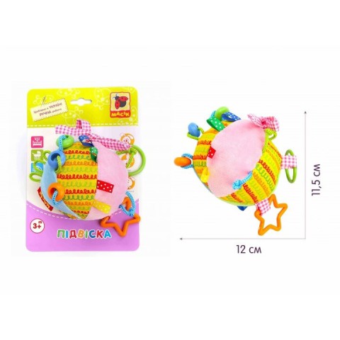 Забавні підвіски для дітей від ТМ Macik - це розвиваючі іграшки, якими можна грати як вдома, так і на прогулянці!Підвіску можна легко закріпити в будь-якому зручному місці - необхідно лише зав'язати тасьми. Вся іграшка виконана з натуральних слинопоглинаючих тканин і абсолютно не псується при частих праннях в пральній машині.М'ячик викликає масу позитивних емоцій завдяки своїй барвистості і багатофункціональності.Розвиваючі елементи: різнокольорові петельки, елементи, що шелестять, пищалка, гремелки, «смачні» вузлики і колечка.Склад: бавовняна тканина; різнофактурні матеріали; швейна фурнітура; звукові елементи; холлофайбер.Розмір: 15,5 × 15 × 4 см.