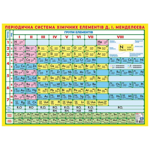 Навчальний плакат формату 870х610 мм демонструє періодичну систему хімічних елементів у сучасному вигляді.