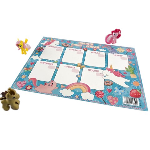 Планер «Плануй-пиши-стирай» - наша допомога в плануванні вашого тижня! Зроблено саме для того, щоб ви могли планувати, корегувати свої плани, стираючи написи і додаючи нові, планер допоможе пам'ятати про всі важливі моменти вашого життя і нічого не пропустити. Планер має зручний формат, його можна закріпити на холодильник за допомогою магнітів, розмістити в зручному місці на столі або там, де він має 100% бути. Виконано в блакитному кольорі, - має відповідне покриття, по якому можна писати маркером або фломастером. Прати написане можна сухим шматком тканини, губкою або серветкою. Розмір: 230 х 170 мм.