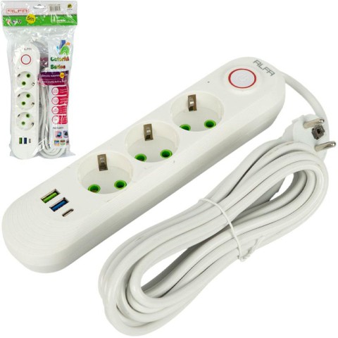 Подовжувач електричний з вимикачем 3 розетки 2 USB 1 Type-C кабель 5 м 496
