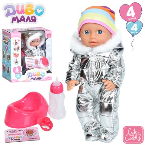 Функціональний пупс «Диво маля» 27 см п’є з пляшечки та ходить на горщик. Повний набір аксесуарів, м’яке тільце, очі заплющуються. Розвиває відповідальність у ігровій формі.