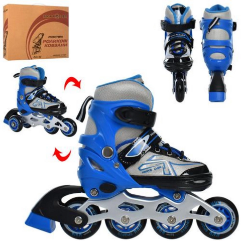 Розсувні дитячі роликові ковзани для початківців ролерів. Катання на роликових ковзанах допоможе розвинути у дитини координацію рухів і почуття рівноваги. Зручний високий напівм'який черевик добре сидить на нозі і не дасть нозі вискочити під час катання, а також захищає ногу від травм. Вентильований лайнер дозволяє нозі дихати. Корпус виготовлений з високоякісного полімеру і оснащений міцною алюмінієвою рамою і поліуретановими колесами. Система регулювання на 4 повних розміру дозволить вашій дитині кататися кілька сезонів, тим самим економити ваші гроші.Ролики розсувніШнурівка+бакля,Алюмінієва рамаКолеса ПУ 64 мм - одне колесо світитьсяУстілка 16 см