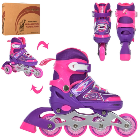 Розсувні дитячі роликові ковзани для початківців ролерів. Катання на роликових ковзанах допоможе розвинути у дитини координацію рухів і почуття рівноваги. Зручний високий напівм'який черевик добре сидить на нозі і не дасть нозі вискочити під час катання, а також захищає ногу від травм. Вентильований лайнер дозволяє нозі дихати. Корпус виготовлений з високоякісного полімеру і оснащений міцною алюмінієвою рамою і поліуретановими колесами. Система регулювання на 4 повних розміру дозволить вашій дитині кататися кілька сезонів, тим самим економити ваші гроші.Ролики розсувніШнурівка+бакля,Алюмінієва рамаКолеса ПУ 64 мм - одне колесо світитьсяУстілка 16 см