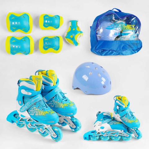 Ролики із захистом, 6917-M – Ролики із захистом (6917-M, розмір 35-38) – дитячі розсувні роликові ковзани з комплектом захисту. Виготовлені з міцного пластику, із PU колесами (діаметр 6.5 см) із підсвічуванням. Устілка 21-24 см. Сприяють розвитку координації та безпеки. Замовляйте на Demsky.com.ua для веселого дозвілля!