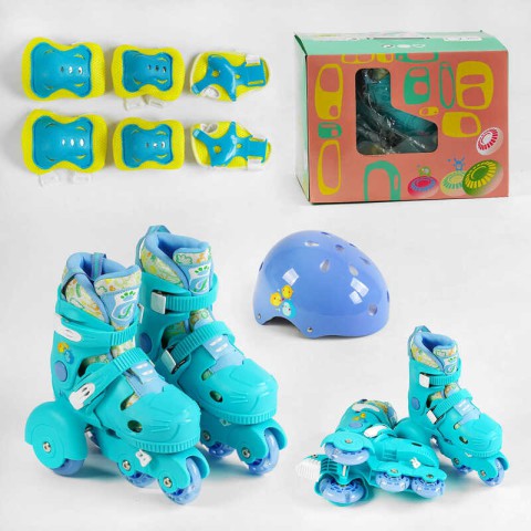 Ролики із захистом, розмір 30-33, синій, PU колеса, переднє колесо зі світловими ефектами, діаметр коліс 6 см – Ролики із захистом (розмір 30-33, синій) – дитячі розсувні роликові ковзани з комплектом захисту. Виготовлені з міцного пластику, із PU колесами (діаметр 6 см), переднє колесо із підсвічуванням. Устілка 18-20 см. Сприяють розвитку координації та безпеки. Замовляйте на Demsky.com.ua для активного дозвілля!
