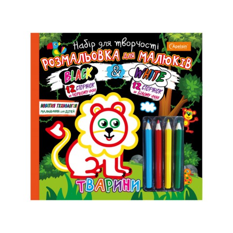 Серія розмальовок "Black and  White" створена за новітньою технологією розвитку художніх здібностей дітей, яка дозволяє розфарбовувати малюнок, не виходячи за контури. Чорний фон на сторінках розмальовки сприяє тому, що навіть якщо дитина малює за межами кольорового контуру, на чорному цього не видно, тому дитина не засмутиться, а малюнок виходить красивий та в межах заданих ліній,Розмальовки укомплектовані олівцями чотирьох кольорів у зручному блістері, які відповідають кольорам контуру малюнка, завдяки чому дитина знає, який колір потрібно обрати і має олівець відповідного кольору.Під кожним малюнком є його назва англійською і українською мовами, що сприяє легкому вивченню англійських слів з раннього віку, коли в дитини формується система образів та асоціацій. Саме тоді дітям найлегше сприймати та запам’ятовувати іншомовні слова.Малюнки в даних розмальовках сучасні й цікаві для дітей, тому можете бути впевнені, що процес розфарбовування перетвориться у захоплюючу гру, яка дозволяє робити перші кроки в малюванні та вивченні англійської мови.А завдяки тому, що із розмальовкою пропонуються олівці потрібних кольорів серія розмальовок "Black and  White" - це готове рішення для розвитку дитячої творчості!