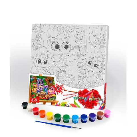 Розпис на полотні Сови, 31x31 см, Сюжет №6, PX-07-06 – Розпис на полотні Сови (31x31 см, PX-07-06) – творчий набір для дітей від 5 років. Включає полотно з контурами сов і фарби. Сприяє розвитку уяви, творчості та дрібної моторики. Ідеально для юних художників. Замовляйте на Demsky.com.ua для творчого дозвілля!