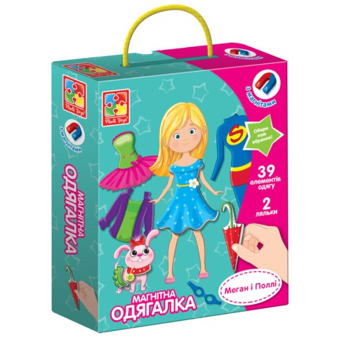 Повна шафа одягу для Меган і аксесуарів для її улюблениці Поллі буде доречним подаруночком для маленьких модниць. Гра настільна Vladi Toys магнітна одягалка “Меган і Поллі” стане чи не улюбленою забавкою дівчаток.