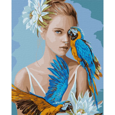Набір для розпису по номерах Дівчина з блакитними папугами, 40x50 см, КНО4802