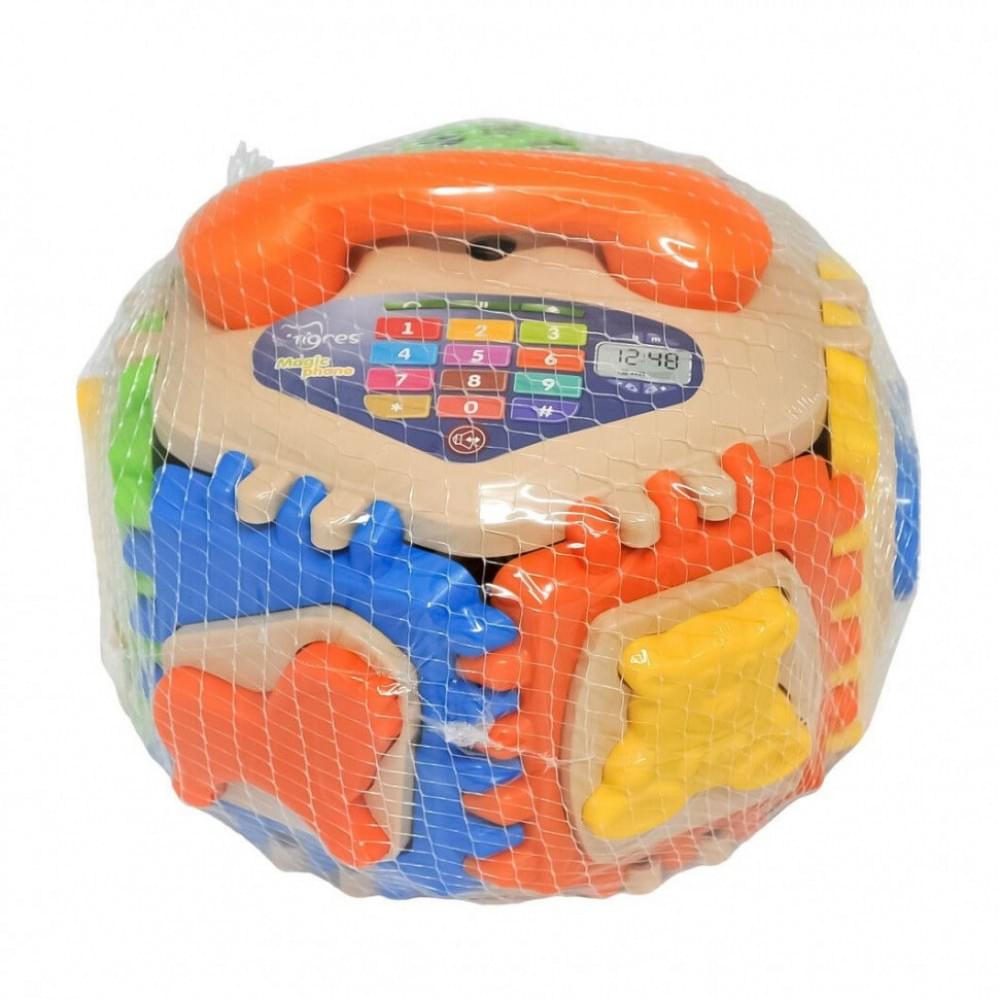 Іграшка складається з 6-ти бічних сторін з фігурами різної форми, в які вставляються фігурки тварин і стінки з отворами різної форми для 6-ти геометричних фігур, телефонна трубка + циферблат.