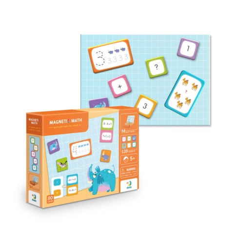 Вивчаємо математику з яскравими магнітами. У грі “Магніти Математика” — магнітна планшетка, підставка під неї, картки для навчання, магнітні елементи з цифрами, тваринками та прикладами. Це ж подвійна користь — дитина весело проводить час і вчиться рахувати швидко. Можна гратися тільки з картками, вчитися писати, чи додавати побудову прикладів з магнітів.Магнітні ігри сприяють розвитку дрібної моторики, уваги та уяви, мотивують дітей вигадувати креативні шляхи розв'язання проблем та просто додають веселощів. Гра може стати улюбленою розвагою усієї родини. Комплектація: 139 магнiтних елементів, 80 карток с завданнями, магнiтна дошка, сухостиральний маркер.Розмір упаковки: 23 x 31 x 6 см Вік: 5+