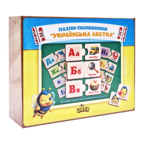 Цей унікальний настільний набір не лише вчить малюків алфавіту, але й розвиває їх уяву та логічне мислення! Кожен елемент цього набору - це пазл-половинка з деревини, яка містить букву алфавіту. Ліворуч розміщена буква, а праворуч - слово, яке починається з цієї самої літери.Ваш малюк з нетерпінням збиратиме кожен пазл, поєднуючи букву з відповідним словом. Від "А" як "Автобус" до "Я" як "Яблуко", цей набір допоможе дітям вивчити алфавіт і відповідні слова, зберігаючи при цьому веселість та цікавість.Зроблений з якісної та безпечної деревини, кожен пазл має гладку поверхню і відмінно підходить для маленьких ручок.