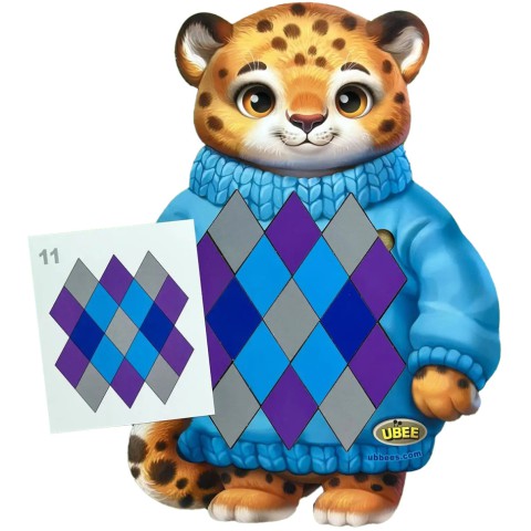 Ця гра захопить дитину з першої ж хвилини, бо наш гепардик великий, яскравий, красивий та дуже милий і має цікаве і непросте завдання: треба так підібрати кольори светрика маленького гепарда, щоб зібрати потрібний малюнок. А в цьому допоможуть картки з завданнями та загадками, над якими треба логічно подумати та підібрати правильні ромбики, розвиваючи уважність та концентрацію- 24 завдання різної складності (12 двосторонніх карток)- 65 ромбиків різних кольорів (синього, червоного, жовтого, зеленого, помаранчевого, фіолетового, блакитного та сірого кольорів) Розміри: 32 х 25 смВік: 3+Ця чудова кольорова мандрівка допоможе малечі розвинути уяву, координацію рук і ока, логічне мислення, виявити творчі здібності. Фантазуйте, створюйте свій дизайн светрика, вивчайте основні кольори, рахуйте ромбики, а ще дослідіть як поєднуються кольори між собою, щоб створити гарні малюнки.Спробуйте запамʼятати як розташовані ромбики на картці та зібрати светрик по памʼяті, а потім перевірити свої вміння.Сміливо експериментуйте і дізнавайтеся нове через цікаву і веселу гру!