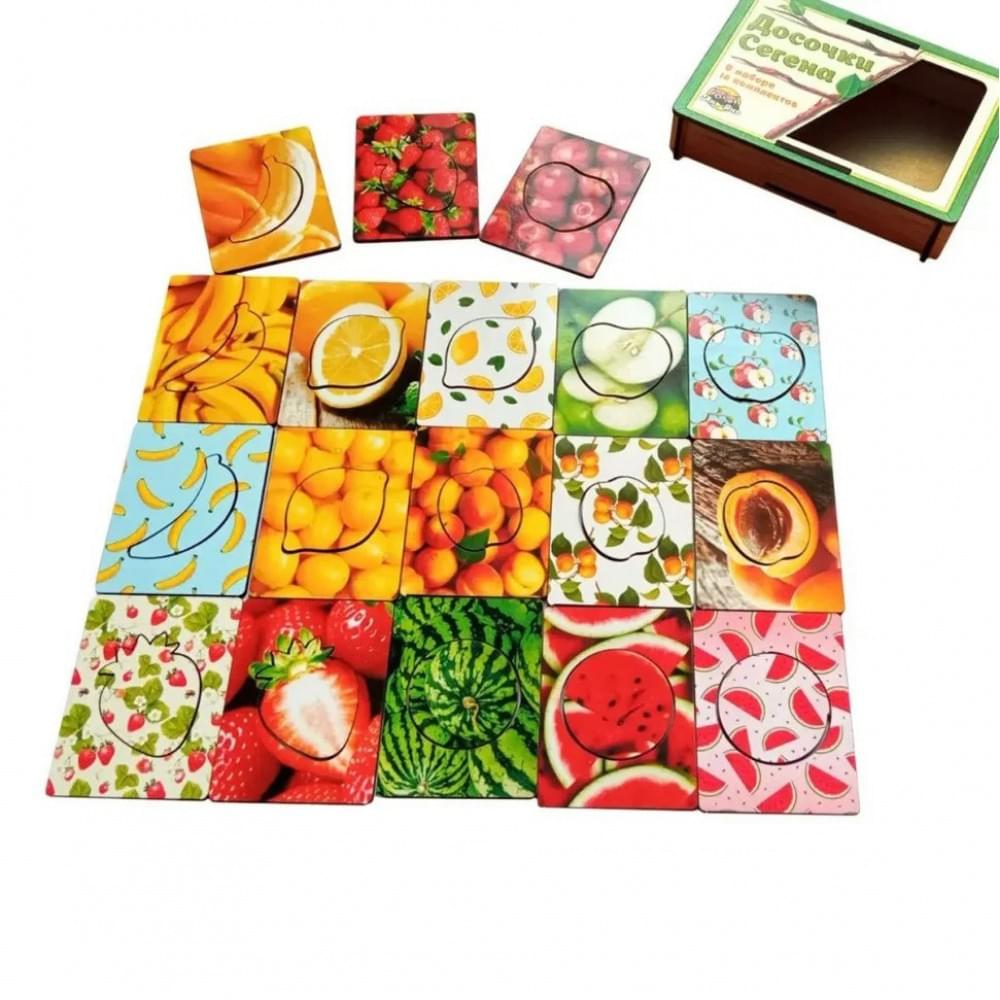 Дощечки Сегена "Фрукти". Запропонуйте малюкові знайти кожному фрукту свій "будиночок-рамочку". Зверніть увагу дитини на те, що кожен фрукт повинен збігтися з потрібним "будиночком" не тільки формою, але і малюнком. Промовляйте назви всіх фруктів, таким чином малюк запам'ятає їх легко та швидко. Знайдіть з дитиною однакові вкладки фруктів (цілих і в розрізі), порахуйте їх. Поговоріть про те, які ці фрукти смакують: кислі або солодкі. У коробці: 18 дощок із малюнками різних фруктів. 1. Розвиток логічного та понятійного мислення. 2. За допомогою такого методичного матеріалу діти пізнають навколишній світ. 3. Розвивається дрібна моторика. Дістаючи і вставляючи певним чином деталі сортера, чудово тренуються пальчики. 4. Працює зорова пам'ять, тренується увага та посидючість. Розмір дошки: 10х7,5 см, коробки: 17,5х12х4 см.