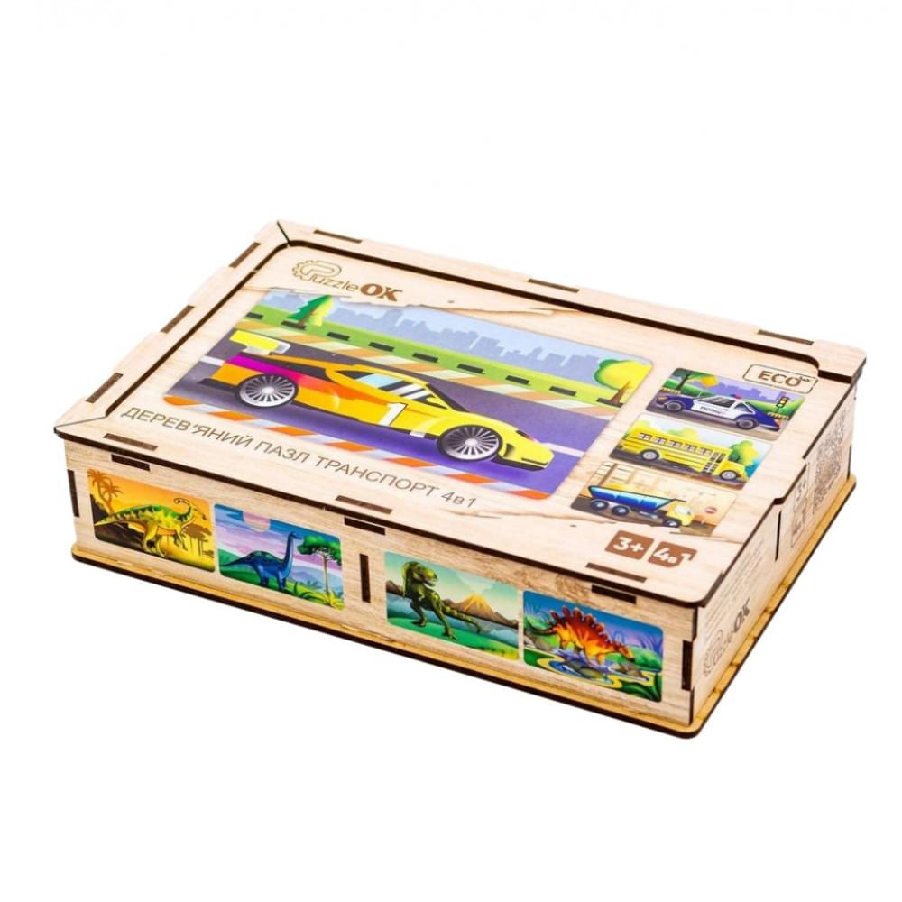 Дерев'яна розвиваюча іграшка у вигляді пазла "Транспорт 4в1" стане захоплюючим подарунком для вашої дитини. До комплекту входить дерев'яна коробка з засувною кришкою та 4 пазли з зображеннями машин - легкової, самоскида, автобуса та поліцейської. Виготовлена з екологічної щільної пресованої деревноволокнистої плити без будь-яких шкідливих домішок. Зображення нанесені безпечними фарбами та стійкі до стирання. Еко-пазл дозволяє розвивати дрібну моторику, уважність, пам'ять.