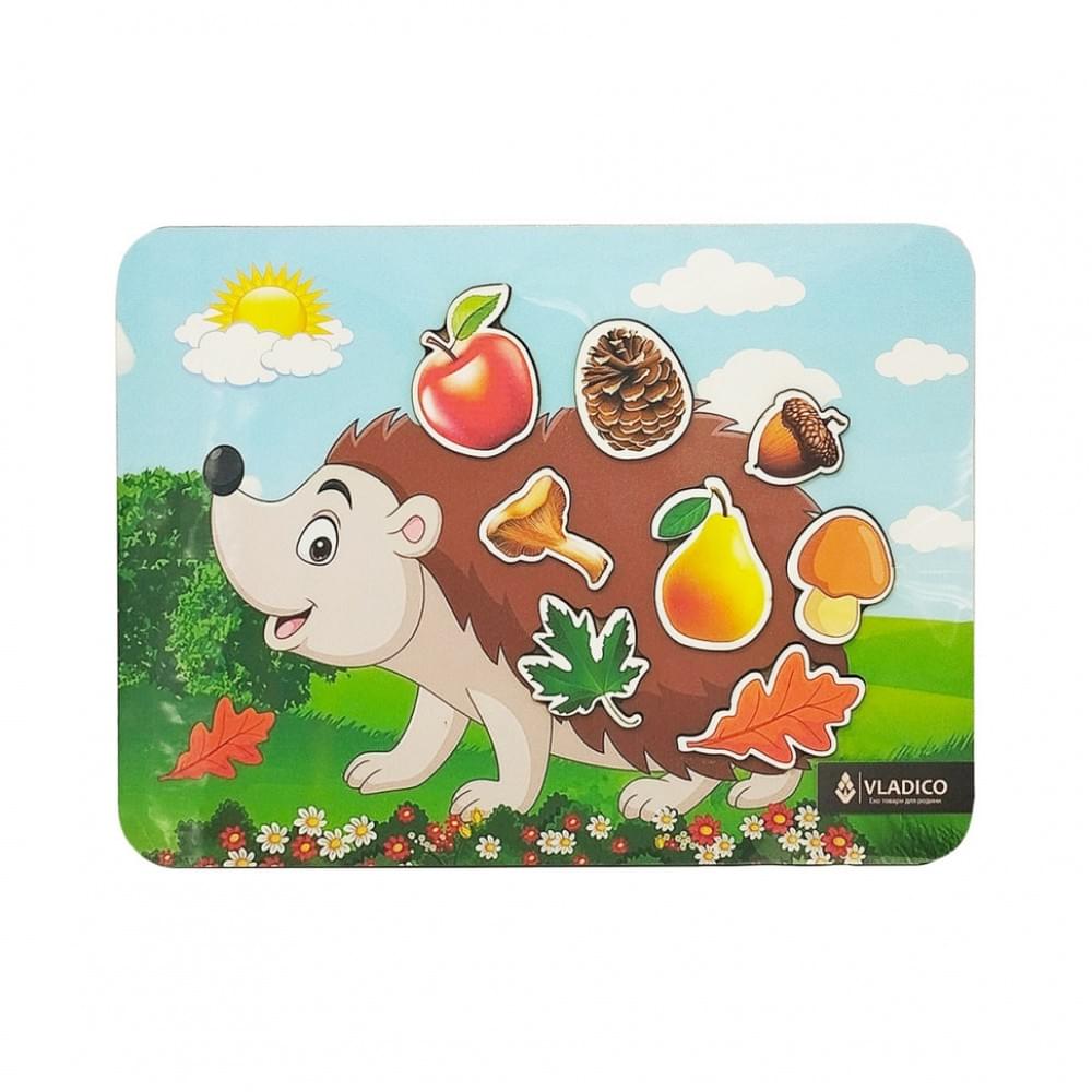 Цей яскравий пазл допоможе дитині весело та корисно провести час. На дерев'яній рамці зображений милий їжачок, який несе на своїй спинці різні предмети. Завдання малюка — знайти правильний елемент та встановити його у відповідне заглиблення.