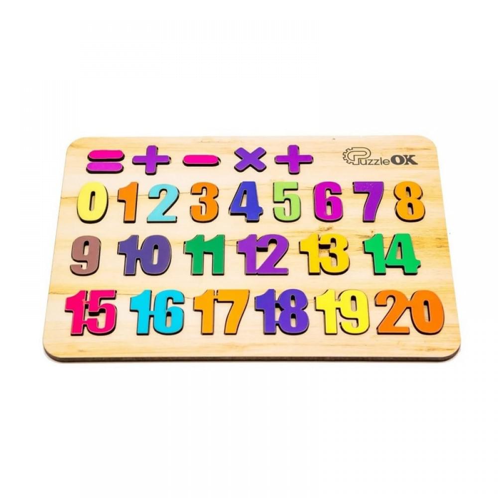 Дерев'яний пазл-вкладиш у форматі А4 містить 27 яскравих дерев'яних деталей, серед яких цифри та математичні знаки. Дитина зможе не лише розпізнавати числа, а й практикувати прості математичні операції - додавання, віднімання, множення та ділення в межах 20. Яскраві кольори деталей привертають увагу, стимулюють логічне мислення та роблять навчання цікавим і захопливим.