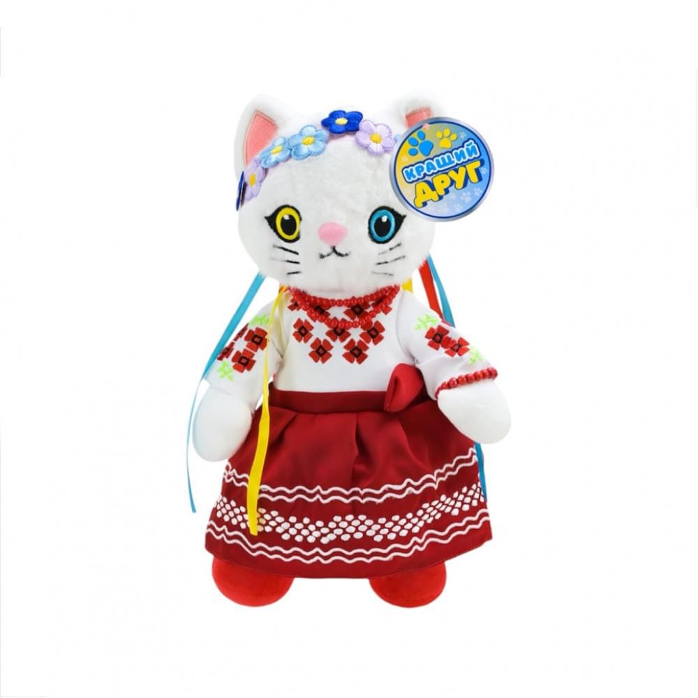 Кішечка вдягнена у традиційне українське вбрання: яскравий віночок, сукню та намисто, що робить її не лише іграшкою, а й символом культури, краси.