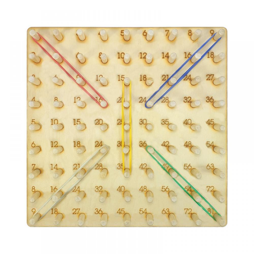 Модель оснащена 81 дерев’яною стійкою та 25 гумками, що дозволяє створювати різноманітні геометричні фігури, візерунки та моделі. Кожна стійка позначена числом відповідно до таблиці Піфагора - це допомагає дитині краще засвоювати принципи множення та закономірності чисел.
