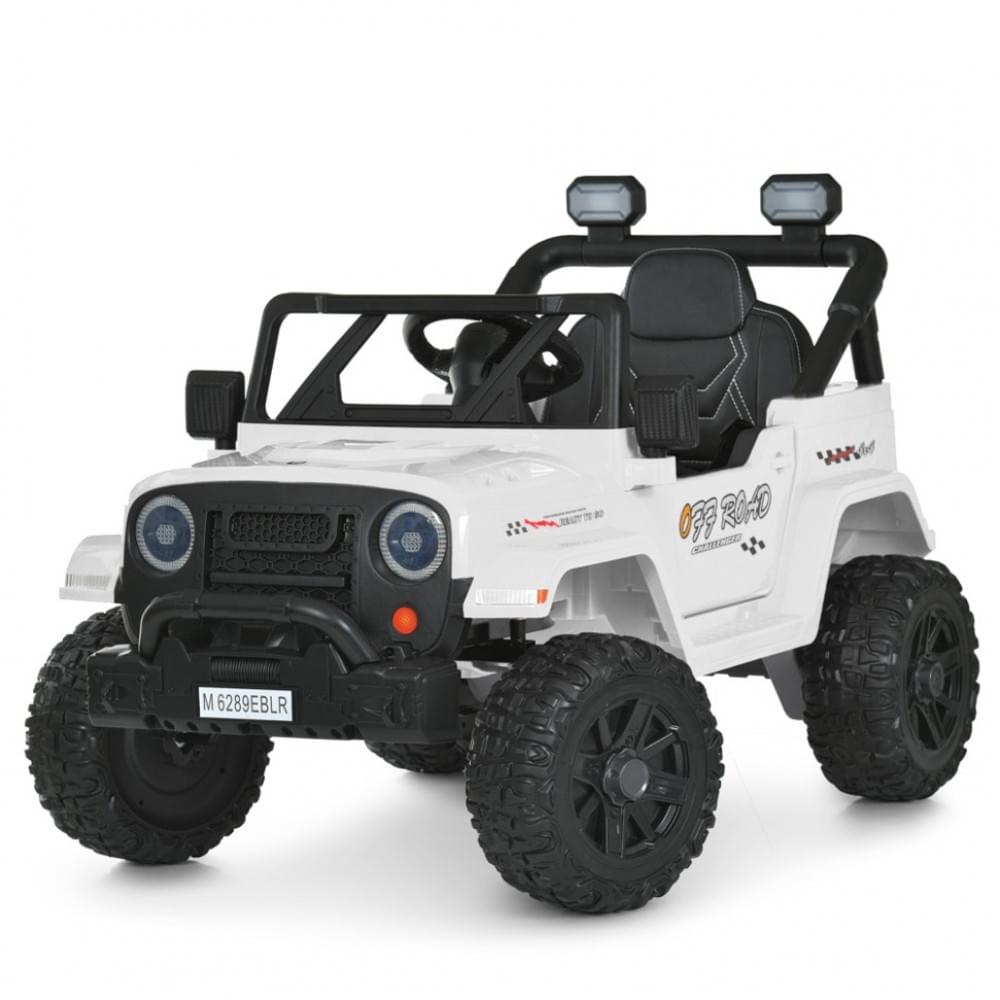 Дитячий електромобіль M 6289 EBLR оснащений двома моторами і акумулятором великої ємності, що забезпечує впевнений хід і тривале катання без частих підзарядок. Великі EVA колеса м'яко проходять нерівності, роблячи поїздку більш плавною і комфортною, а сидіння з чохлом з екошкіри додає зручності і приємних тактильних відчуттів. Світяться фари і вбудована магнітола з музикою створюють атмосферу справжньої пригоди і роблять кожну поїздку ще більш захоплюючою.