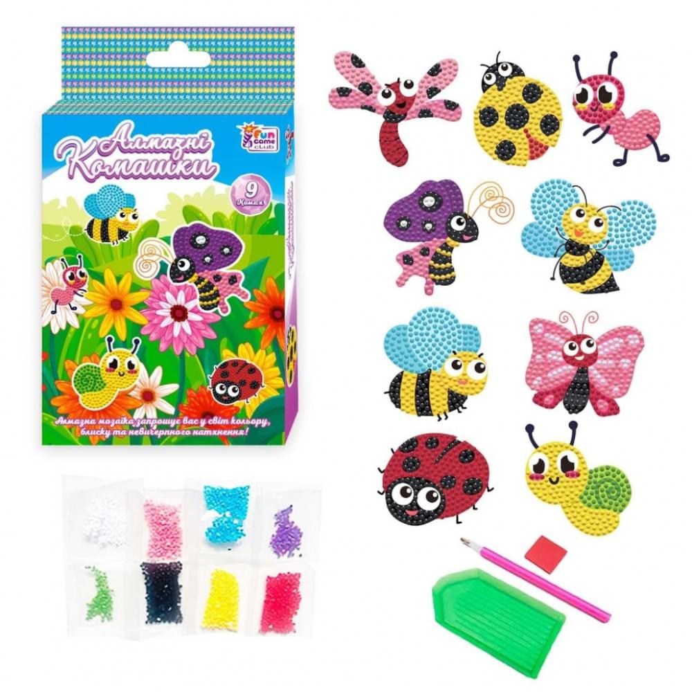 До набору включено все необхідне для того, аби зробити свій власний набір наліпок із комашками, якими можна буде потім прикрасити свої записи, або простір навколо себе. Складність такої роботи є невисокою, тому вона чудово підійде для молодших дітей. Алмазні мозаїки є веселим способом розвинути дрібну моторику та акуратність та терплячість дитини.