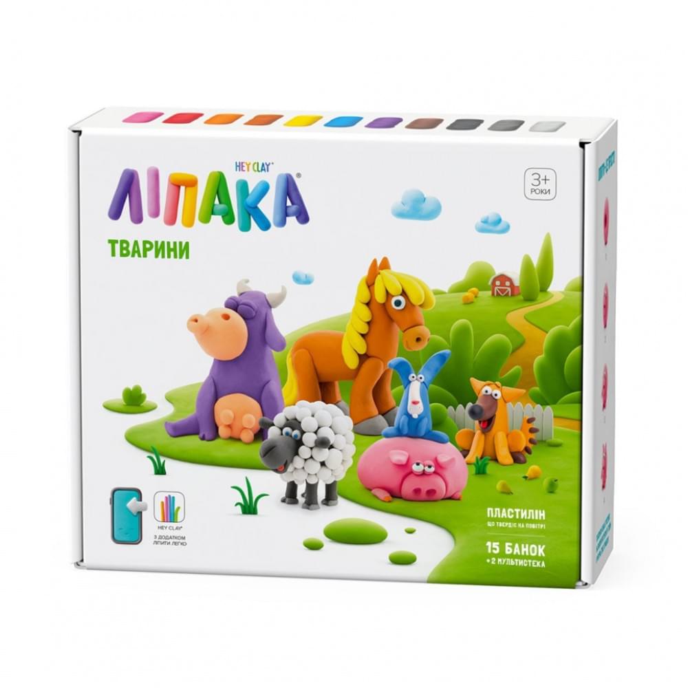 Меганабір пластиліну, що самостійно твердіє, ЛІПАКА – СВІЙСЬКІ ТВАРИНИ – розважить і малюків і дорослих. За допомогою анімаційних інструкцій в додатку HEY CLAY, Ви зможете зліпити кумедних тваринок: корівку, коника, кролика, свинку, собачку та вівцю. Пластилін твердіє на повітрі протягом 24 годин, після чого можна гратися створеними фігурками.