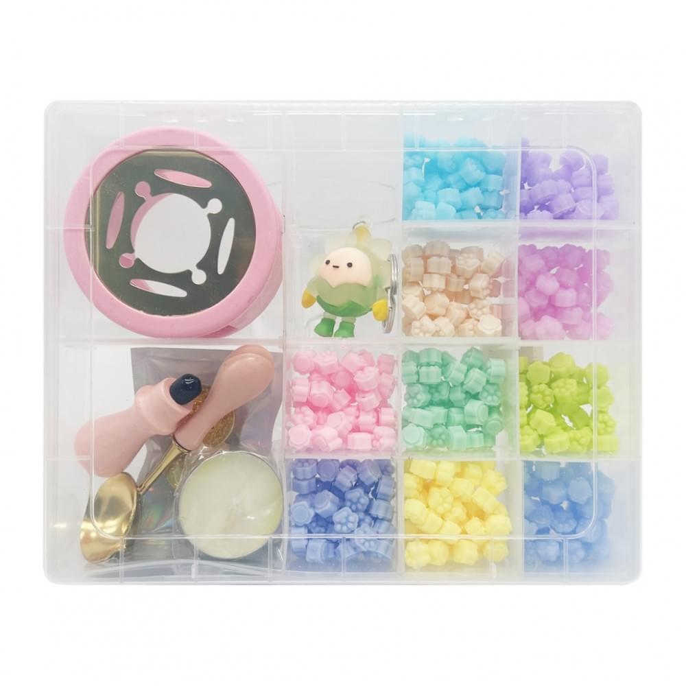 Усі елементи зручно розміщені у міцному пластиковому боксі, що забезпечує порядок, легке зберігання та комфортне транспортування. У комплект входить усе необхідне для роботи: парафінова свічка для нагрівання, ложечка для плавлення воску, підставка для нагрівання та металева печать з витонченими змінними насадками, які дозволяють створювати різні варіанти відбитків.